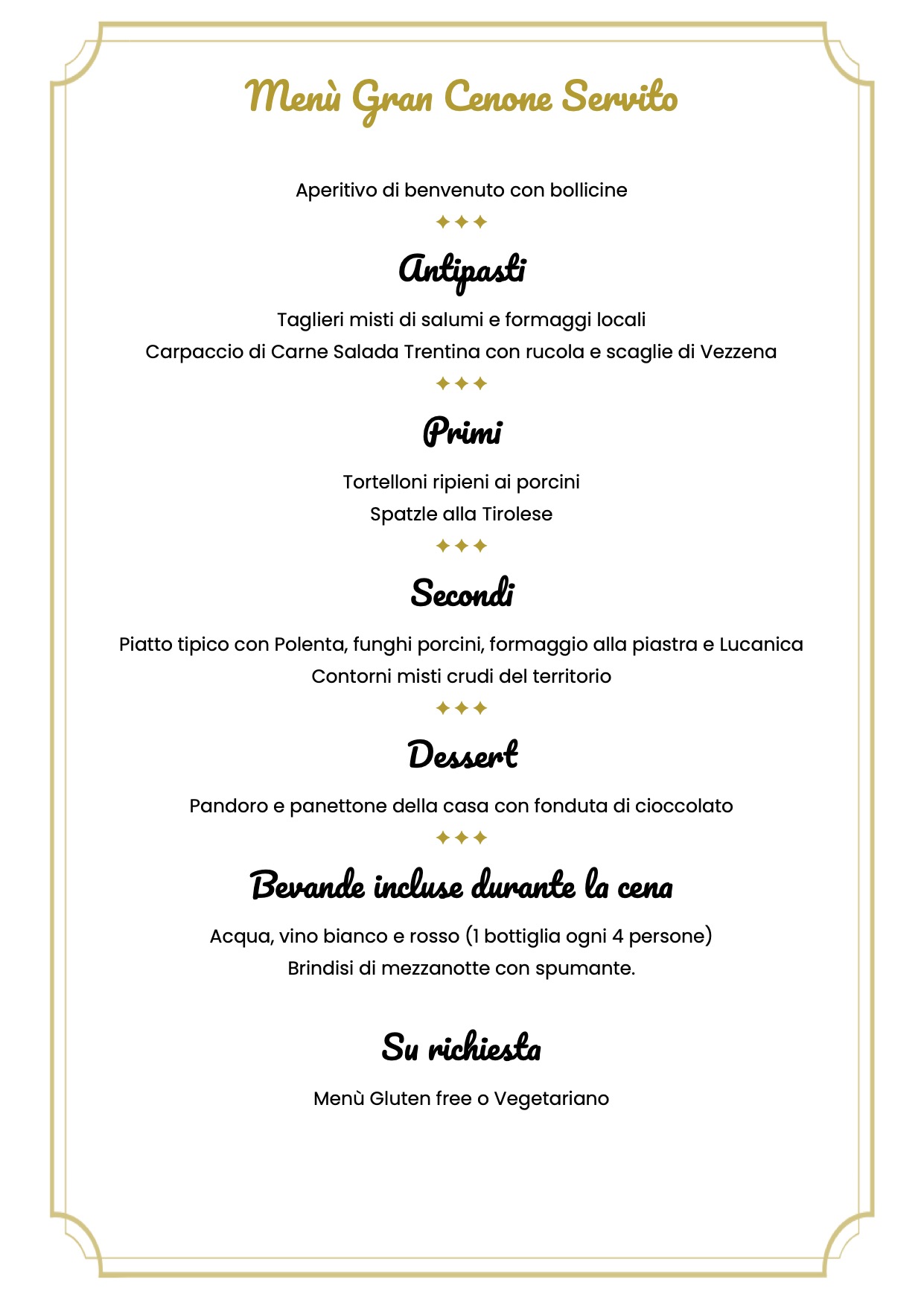 Se scegli il Pacchetto Platinum e vuoi fare di questa esperienza una piccola vacanza in montagna abbiamo a disposizione Hotel B&B convenzionati in località Tonezza del Cimone, a circa 45 minuti di auto dall’evento. Queste strutture anche sotto Capodanno accettano i nostri clienti per 2 notti soltanto! Il Servizio Navetta privata dagli hotel B&B all’evento A/R è incluso nel prezzo per evitare ritiri patente 😇