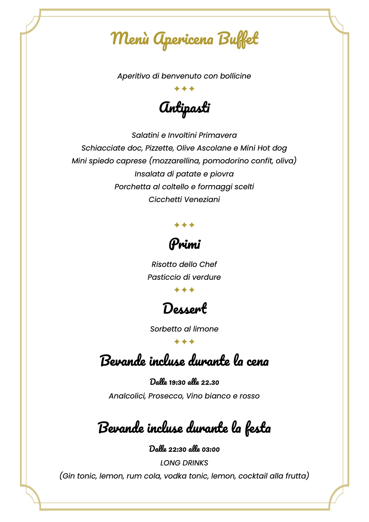 ⏰ 20:00 – 22:30 = Cena a buffet con vino, birra ed analcolici (cena animata e dj set, live cooking)